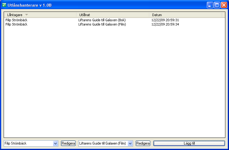 - Längst ner i fönstret finns det två listrutor och tre knappar. Dessa används för att ange ett nytt lån. I den vänstra rutan anger du låntagaren (eller väljer den i listan) och i den högra rutan anger du vad som personen ska låna. Notera att alla objekt skrivs med typen inom parentes. Detta används endast då det finns flera objekt med samma namn, men av olika typ. Inträffar en sådan konflikt kommer porgrammet att meddela dig. Klicka till sist på knappen Lägg till. Du kan skriva helt nya användare och objekt i rutorna. Om du har gjort det så kommer programmet att fråga om du vill lägga till den användaren eller objektet.