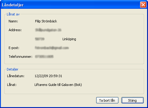 Här visas all tillgänglig information om ett lån. Du visar fönstret genom att dubbelklicka på valfri rad i listan i huvudfönstret. Du kan också klicka på Ta bort lån för att visa att låntagaren har lämnat tillbaka det den skulle.