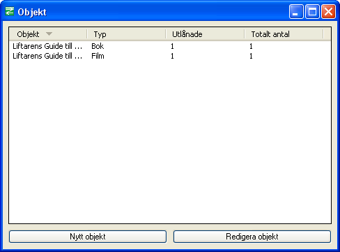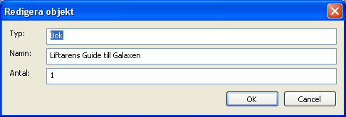 När du har angivit ett nytt objekt i huvudfönstret, eller när du redigerar eller skapar ett nytt objekt i objektfönstret så visas detta fönster. Skriv in all information om objektet, samt ett antal. Detta antal representerar det antal objekt du har tillgängligt. Du kommer inte att kunna låna ut fler av det här objektet än det antal du har, vilket är väldigt logiskt. Du kan ju inte låna ut fler böcker än vad du har.