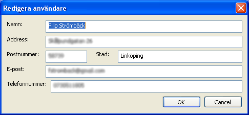 När du har angivit en ny låntagare i huvudfönstret, eller när du har klickat på Ny låntagare/Redigera låntagare i Låntagarfönstret så visas fönstret redigera användare. Här anger du all information om användaren.