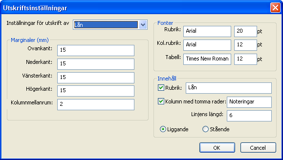 När du trycker på Ctrl+S i huvudfönstret visas utskriftsinställningarna. De låter dig (sedan version 1.2) ställa in de inställningar som tidigare bara fanns tillgängliga i print.ini. Först väljer du vilken utskrift du vill ändra inställningarna för i listan längst upp till vänster, sedan är det bara att ändra de värden du vill och klicka på OK. Se till att du stavar rätt på fonnamnena, annars kanske ingen font används. Fontstorleken mäts i points, precis som i Word. Listkolumnen är en ny funktion som inkluderades i version 1.1, när du har aktiverat den så kommer en ny kolumn med tomma linjer att infogas längst till höger i din utskrift. Detta kan vara användbart till exempel vid en inventation av de objekt du ska ha kvar hemma. Textrutan efter kryssrutan låter dig ange en rubrik för kolumnen. Linjebredden mäts i antalet understreck (_) som linjen ska bestå av.